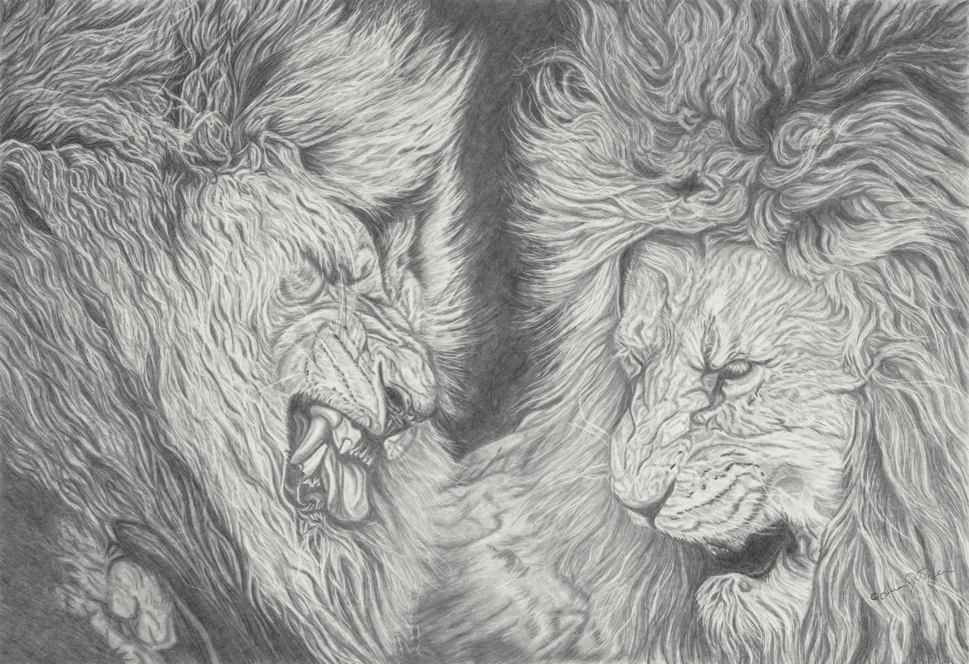 Family is as important to lions as it is to us. But occasionally brothers argue as in this drawing from a photo taken by Russ Bridges. This original is beautifully framed under glass and ready to be hung in a special place in your home or office. The frame is bluish grey with a large black mat and smaller blue grey mat. The framed dimensions are 20" h x 25" w x 1"d. This work makes a wonderful companion piece to "Lion Cubs". Shipping to lower 48 states included.